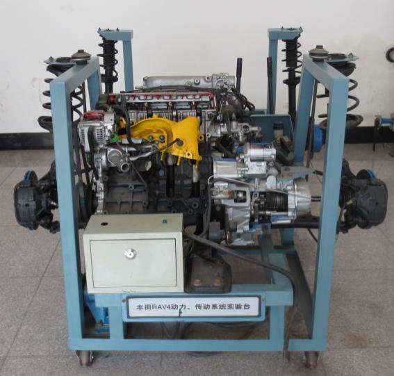 丰田RAV4车型动力传动系统实验台由电喷发动机总成、前后驱动桥总成、手动变速器总成、分动器总成、离合器总成、前后传动轴总成、悬挂总成、转向器和连动机构、制动器总成等组成。