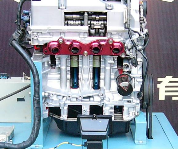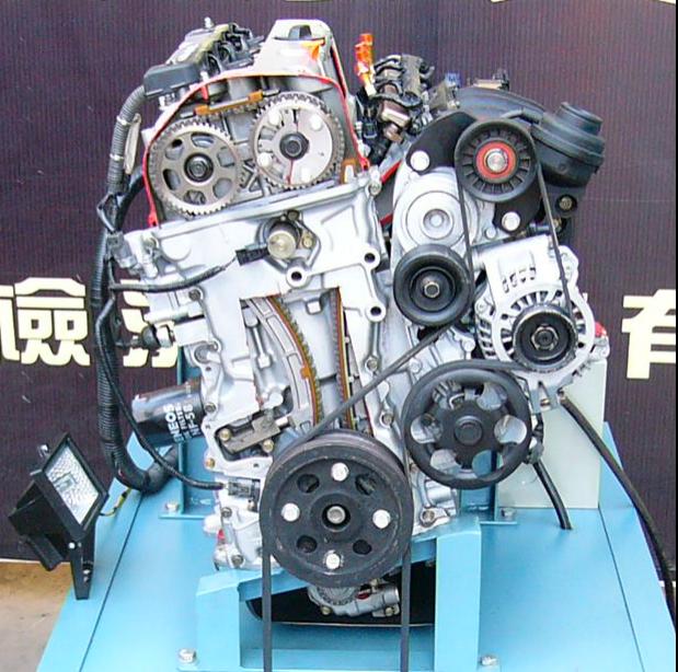 实验台采用本田雅阁2.0 I-VTEC发动机总成解剖制作。包括发动机机械机构总成、进气压力传感器、节气门位置传感器、转速传感器、氧传感器、水温传感器、进气温度传感器、爆震传感器、喷油器、点火线圈、分电器、怠速阀、i-VTEC电磁阀和控制电脑等。发动机经过解剖,可以看到配气机构、活塞连杆结构的运行状况。低速电机驱动发动机运转。配有滚轮钢质支架,可以轻松移动。发动机运行过程中,可实现模拟点火和模拟喷油。