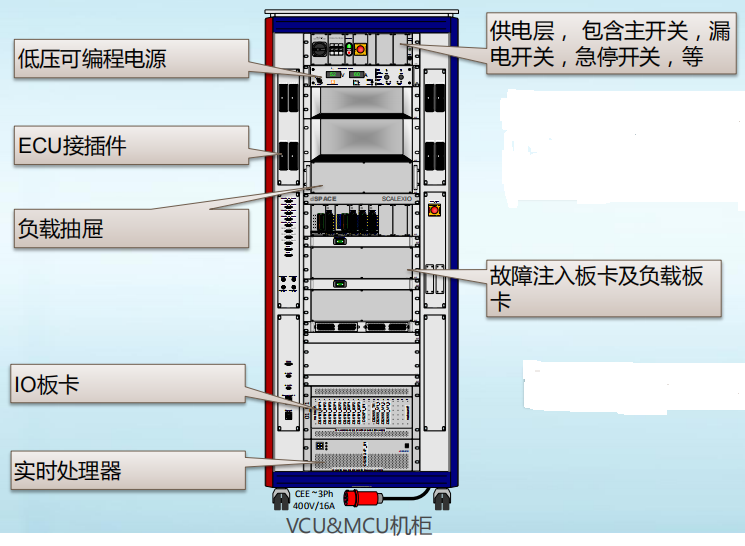 整套HIL系统助力该校在此领域的发展,一方面可用于自身的科研及产品开发,另一方面也可以帮助企业进行相关测试验证,成为产学结合的多功能平台。机柜如图1所示。