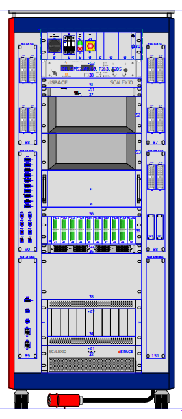 系统硬件:包含SCALEXIO实时处理器,两块DS6101板卡和一块DS6201板卡,主要负责模拟信号和数字信号的采集和输出,两块DS2671总线通讯板卡,提供8路总线,可以满足CAN、LIN和FlexRay不同通讯协议的信息交互;两块DS2655FPGA板卡和10块故障注入板卡等。所有硬件集成于一体式的机柜内。