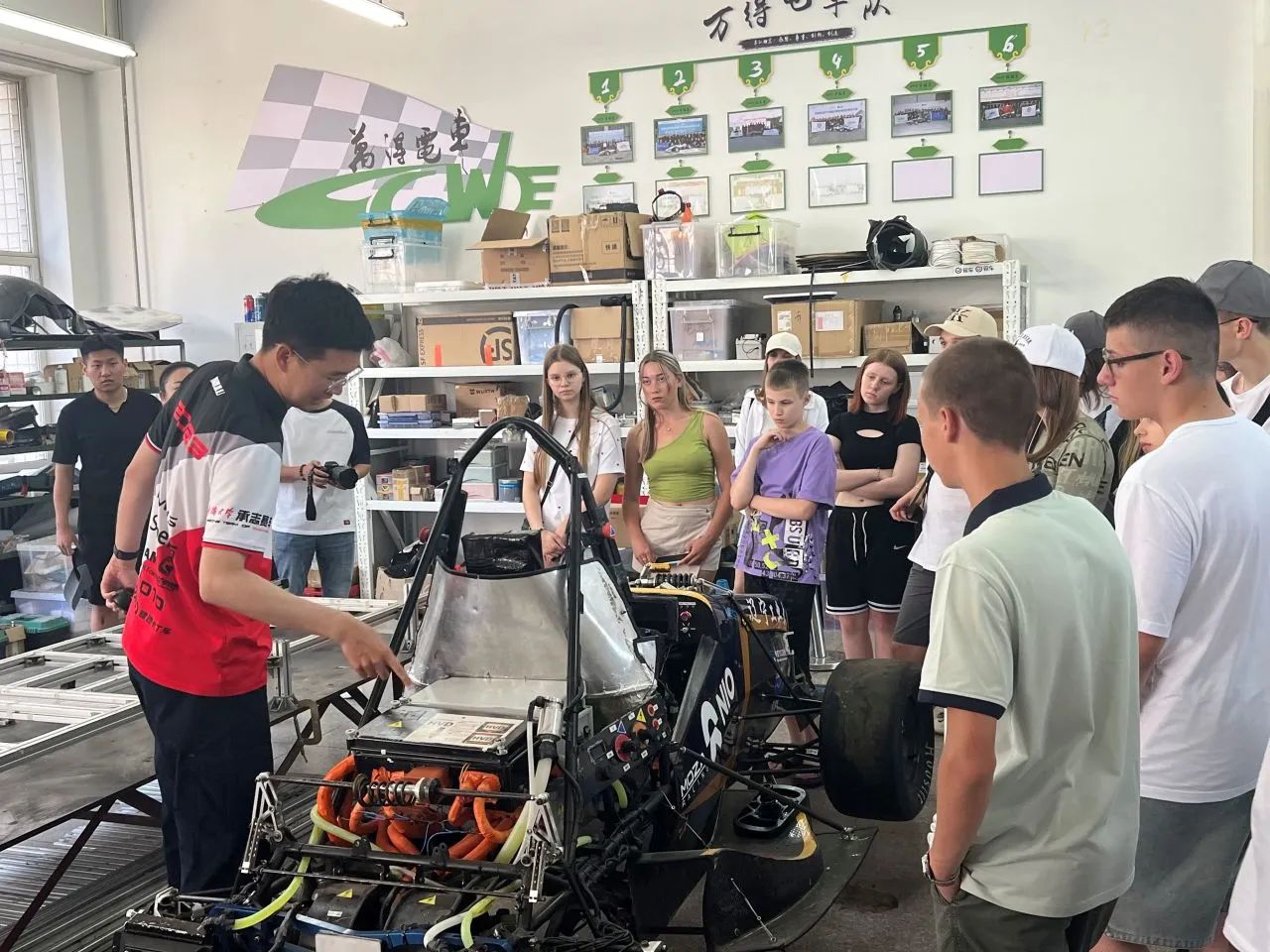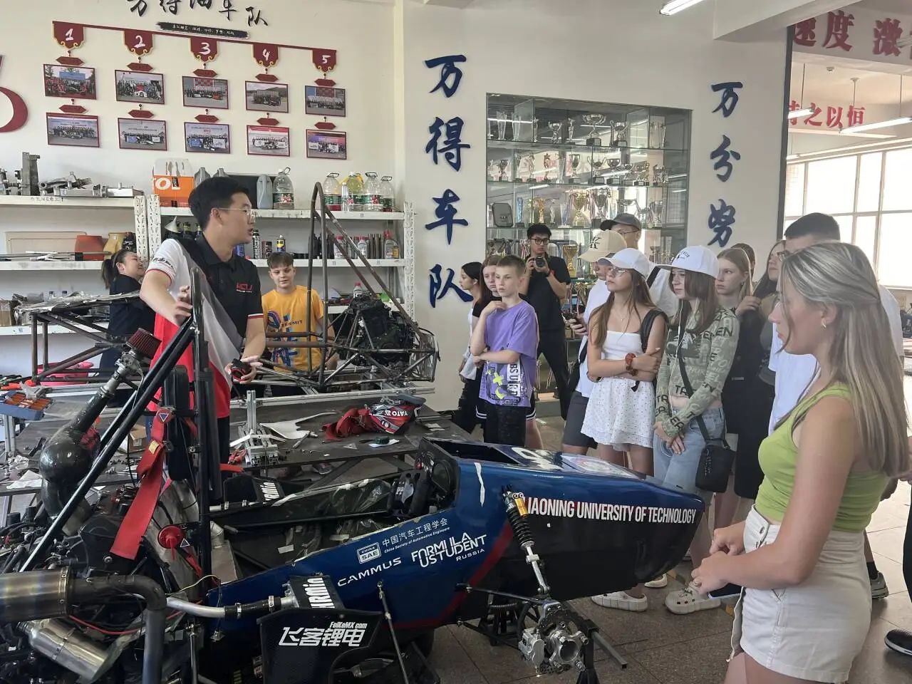 移步至车队荣誉展厅,车队队员向来访的外籍同学详细介绍了中国大学生方程式赛事以及中国赛车文化。