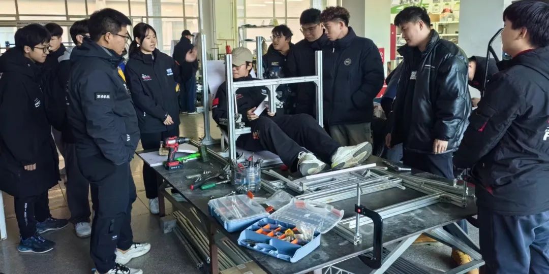 1月14日,队员们不断思索、交流、研究,互相取长补短,在车库一步步搭建人机台架。