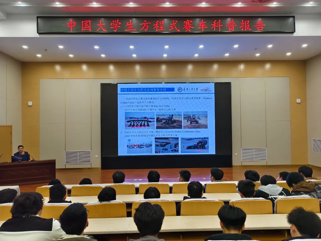 于11月22日在5号楼党员活动中心举办了以“中国大学生方程式赛车”为主题的科普讲座。此次讲座荣幸邀请到了李刚院长,以及来自万得车队的油车、电车、无人车的三位队长作为主讲嘉宾,2024级研究生、2021级、2022级及2023级部分本科生参加了本次活动。