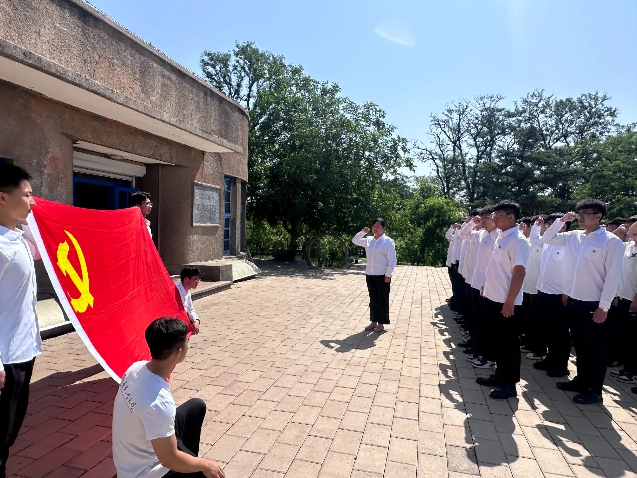 在组织毕业生党员聆听专题党课、参观红色展馆过程中,重温入党誓词。面向鲜红的中国共产党党旗,党员们高举右拳,以铿锵有力的声音重温入党誓词。全体毕业生党员神情庄重,声音洪亮、字字千钧,他们必将不忘初心、牢记使命,以实际行动践行担当与忠诚。